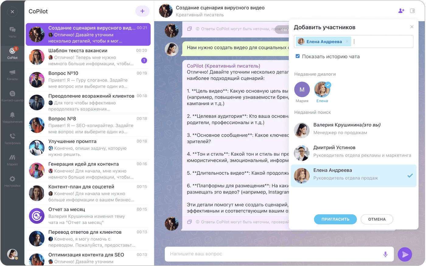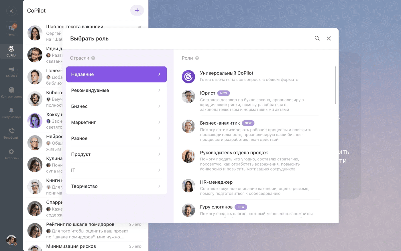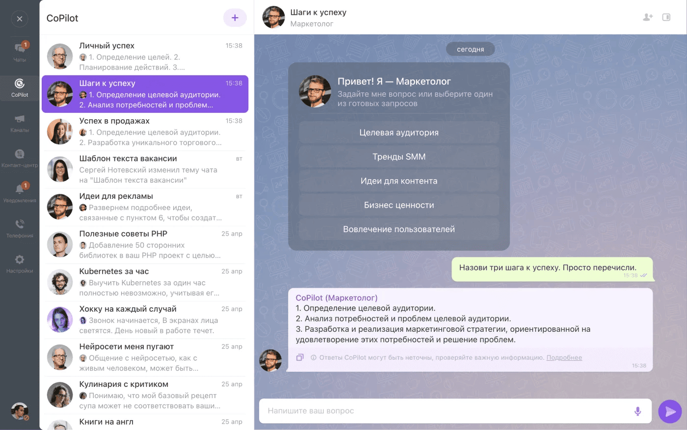 Общайтесь с CoPilot, как с настоящим экспертом. Если вам необходимо проконсультироваться с маркетологом, IT-специалистом или даже психоаналитиком, начните чат с выбранной ролью.