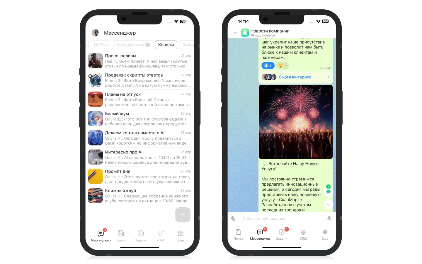 Создавайте каналы и адресно делитесь важной информацией. Каналы могут быть для всей компании или для конкретных отделов, открытые или закрытые, тематические или авторские.