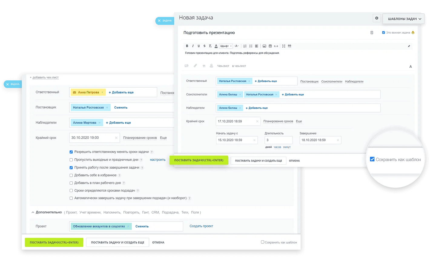 Ставьте и контролируйте задачи любой сложности. Добавляйте чек-листы и файлы для работы. Выбирайте ответственных, наблюдателей и сроки.