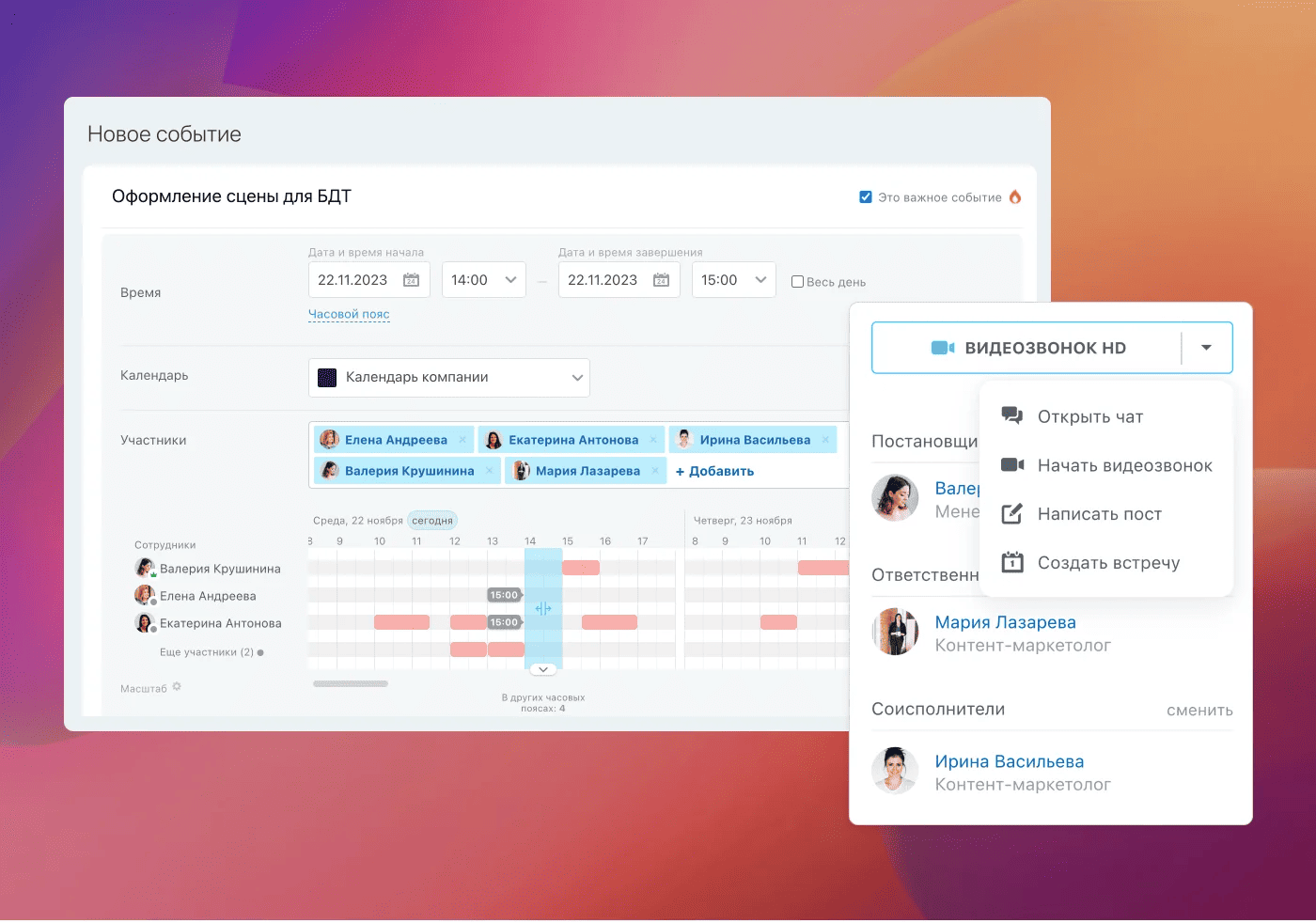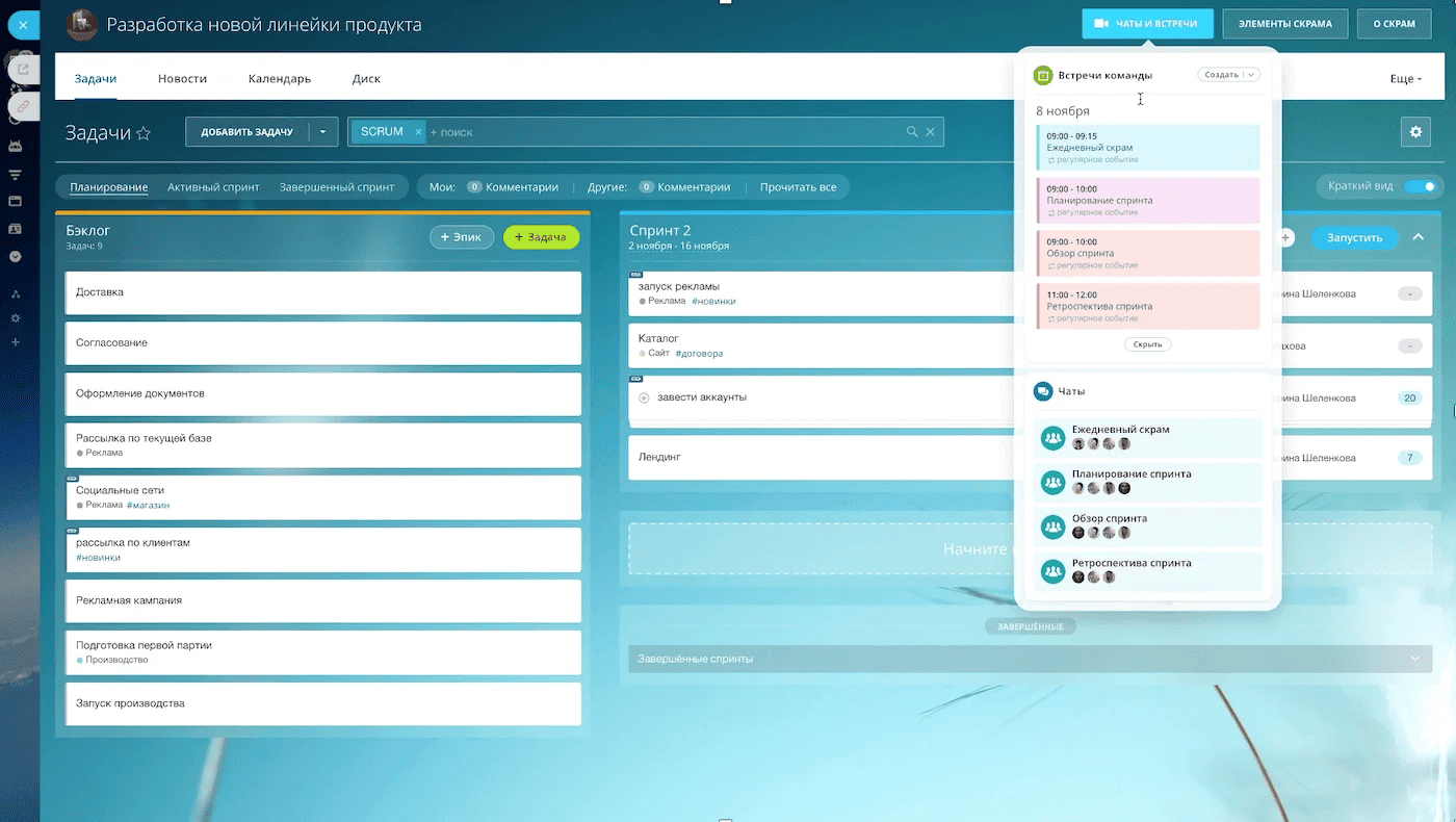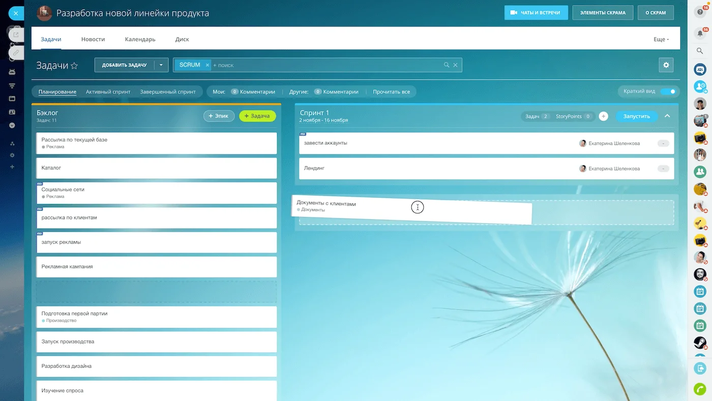 Формируйте спринты из задач и обсуждайте рабочий процесс на регулярных встречах. Всё интегрировано с календарем, чатами и видеозвонками в Битрикс24.