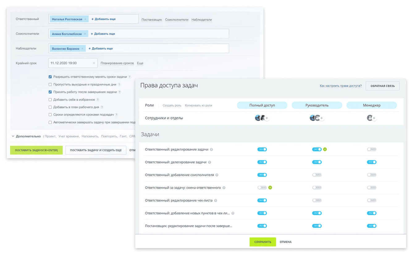 Распределите роли в задаче: ответственный, постановщик и наблюдатели.