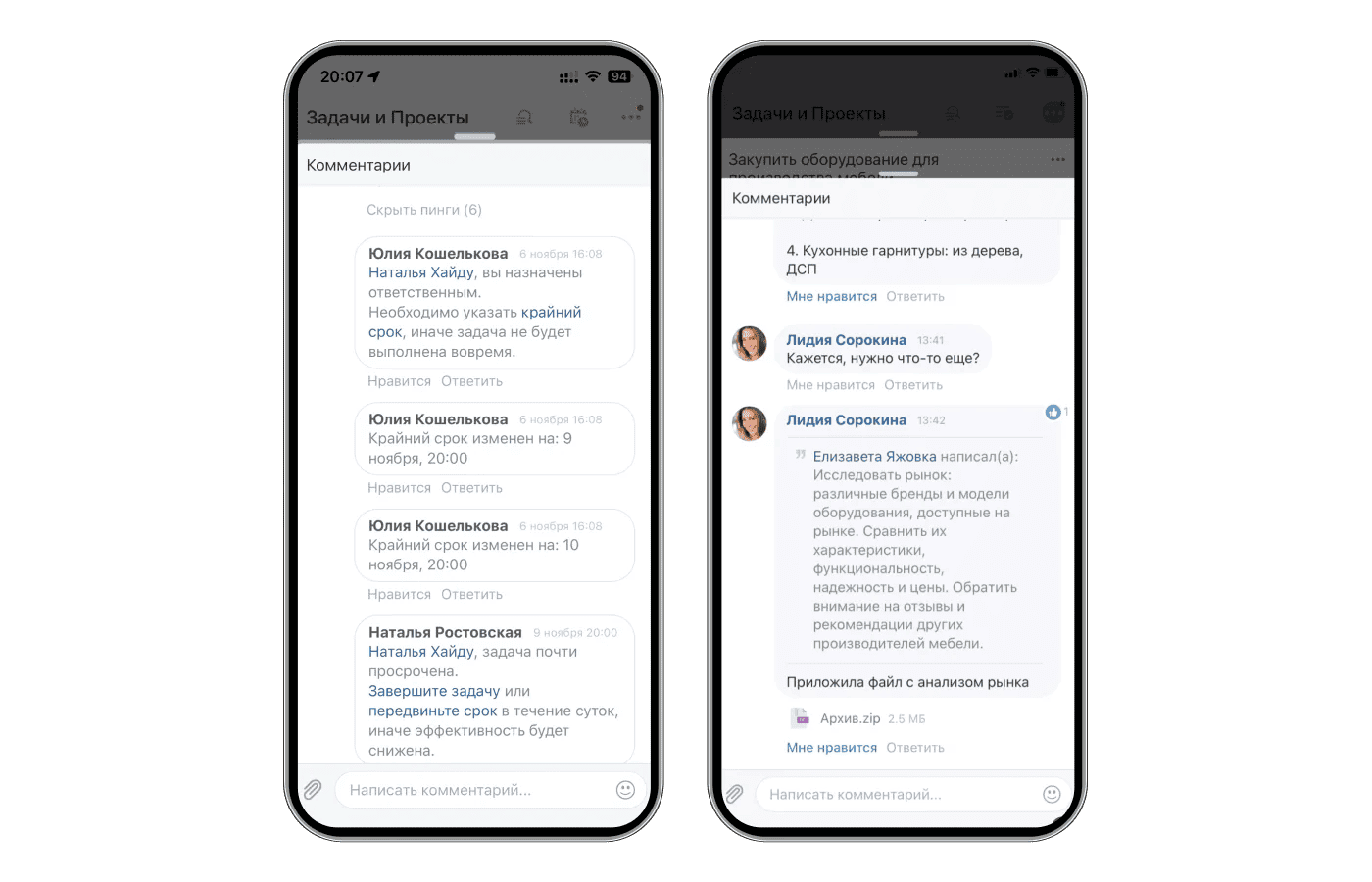 В карточке каждой задачи можно увидеть, когда она была поставлена, какие сотрудники над ней работали, как велось её обсуждение.