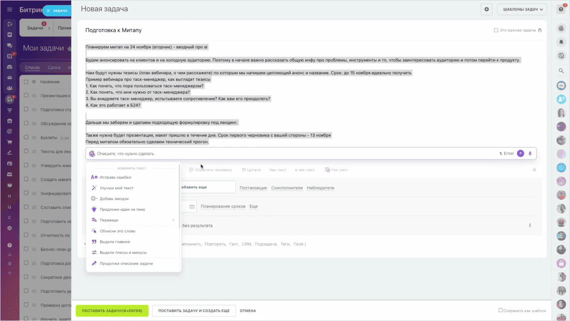 AI-ассистент может сделать из черновика грамотный и понятный текст, составить чек-лист. А ещe прочитает за вас комментарии и напишет краткую сводку.
