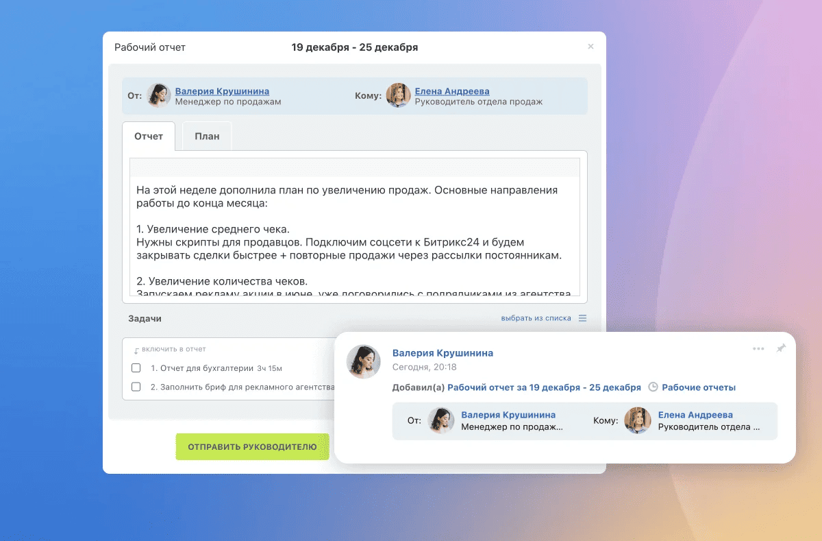 Создавайте задачу прямо из сообщения в чате, формируйте чек-листы, устанавливайте сроки, контролируйте выполнение.