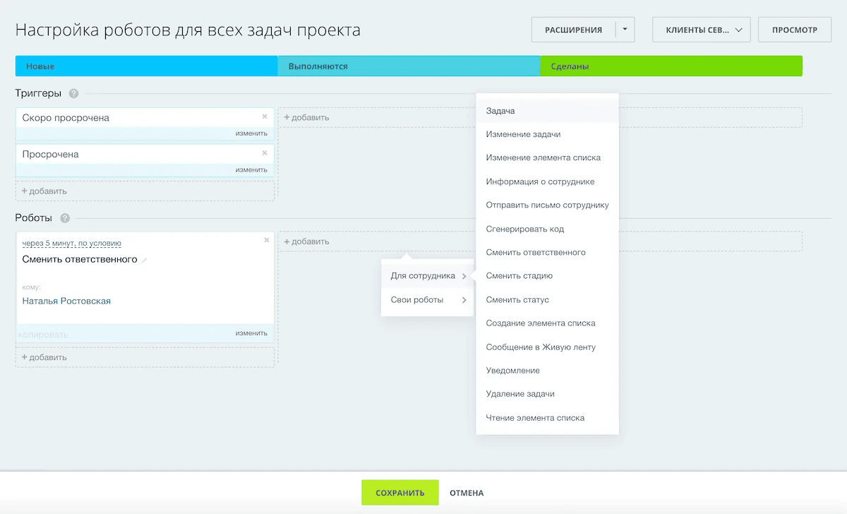 Настройте автоматическую отправку писем, смену ответственного или статуса задачи. Не нужно специальных навыков — справится любой сотрудник.